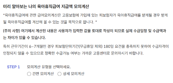 이 정보를 입력하면 예상 급여를 확인할 수 있습니다. 이는 육아휴직을 계획할 때 유용한 도구로 활용될 수 있습니다.